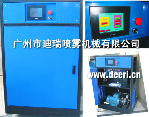 PLC控制造霧機的工作原理是利用高壓柱塞泵將水壓提高到7Mpa,然后將加壓后的水經耐高壓輸送管線由專業(yè)霧化噴嘴將其霧化,產生3—15μm的微霧顆粒,使其能夠迅速從空氣中吸收熱量完成汽化并擴散,從而完成空氣加濕、降溫的目的.加濕量為150~900kg/h。